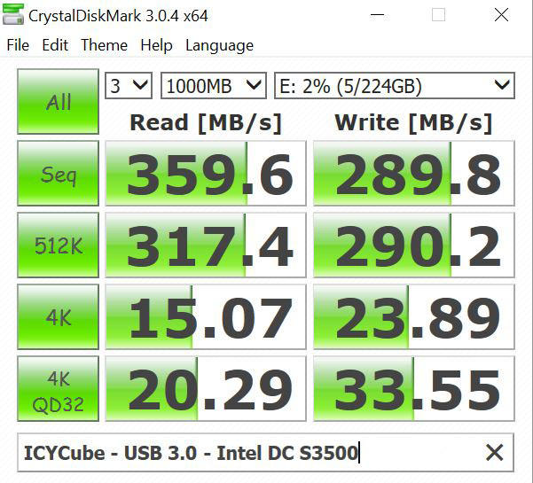 Here we see the results of our USB 3.0 tests with the Intel DC S3500 SSD. We reach speeds of 359.6 MB/s Reads and 289.8 MB/s Writes with this drive.