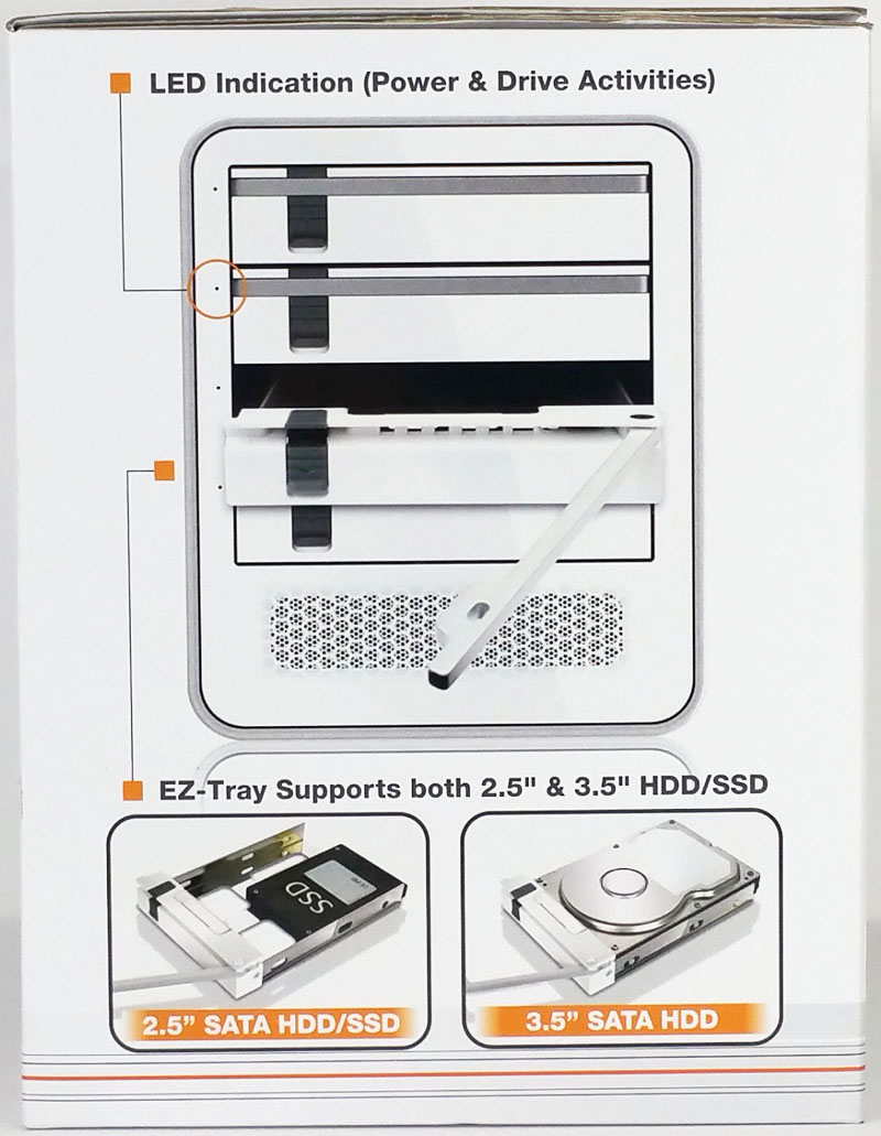 The left side of the retail box highlights LED indicators and 2.5” & 3.5” HDD/SSD drive capabilities.