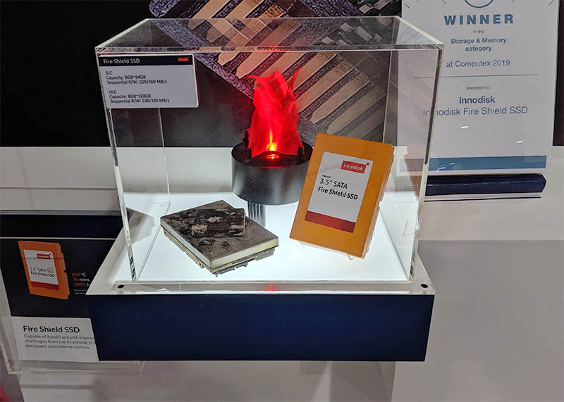 At Computex 2019 in Taipei, Taiwan Innodisk showed off a unique SSD design. The Innodisk Fire Shield SSD is designed to retain data even after bathing in direct flames at 800C for 30 minutes. As vehicles get more sensors including cameras, Innodisk hopes that the Fire Shield SSD can find traction in “black box” applications where data can be recovered from accidents involving fire.