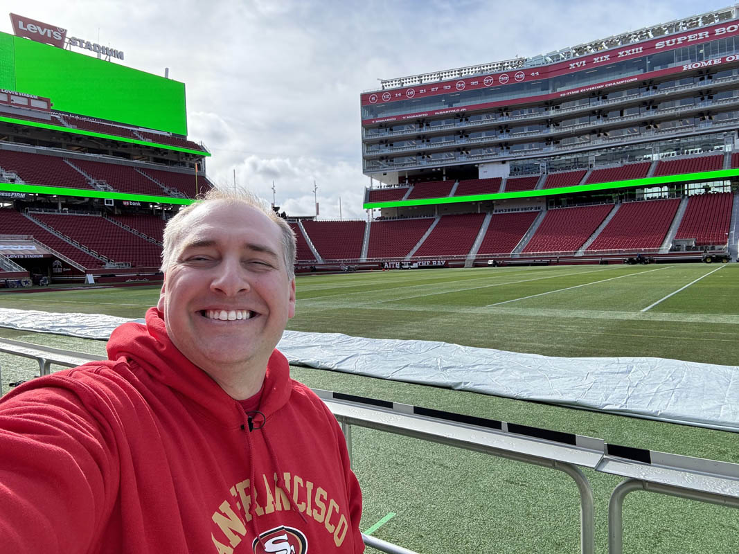 Patrick On The Field At Levis Stadium With The Press Box Above