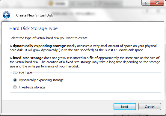 Virtual Box – New Virtual Machine Wizard – New Virtual Hard Disk – Fixed or Dynamic