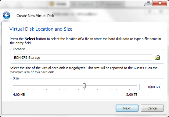 Virtual Box – New Virtual Machine Wizard – New Virtual Hard Disk – Set Size
