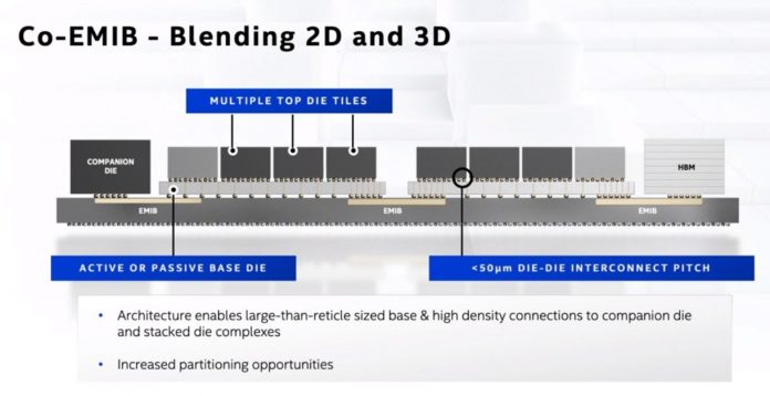 Intel also discussed Co-EMIB. Here we have EMIB plus stacking. Using this approach, Intel can integrate IP and chiplets potentially from third parties, and build larger more complex chip structures.