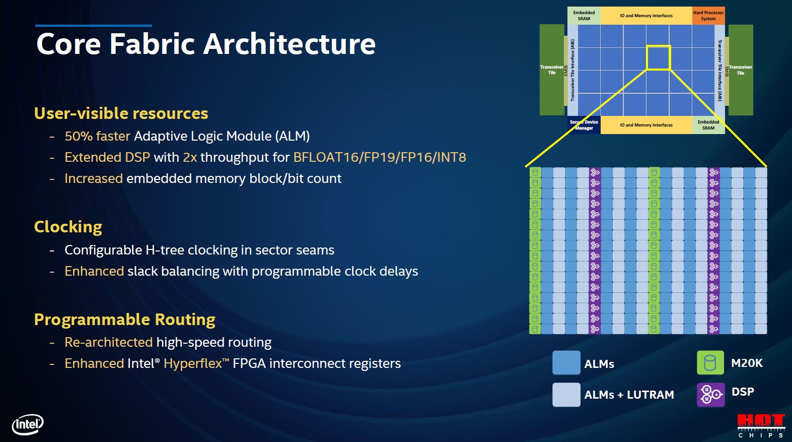 Intel as part of its core fabric has its Adaptive Logic Modules (ALMs), as well as embedded memory, and DSP segments designed to accelerate bfloat16, and INT8 for AI workloads among other uses.