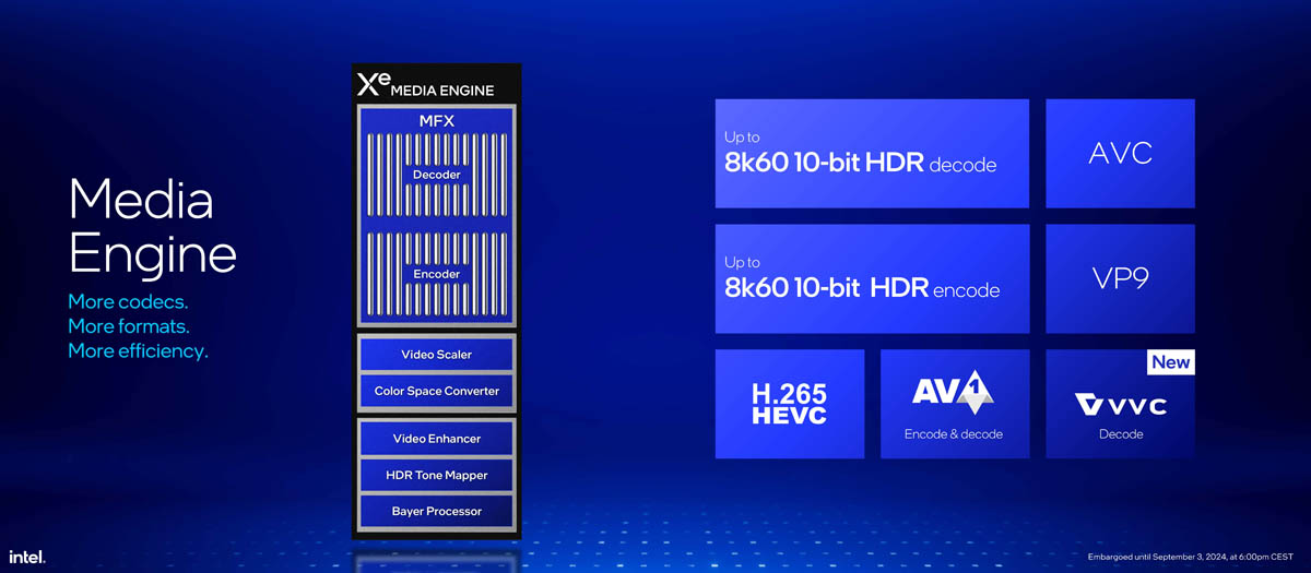 Intel is upgrading the Xe Media Engine with things like VVC or h.266. It is only a ~10% improvement from a file size perspective over AV1, but it has other features like supporting 360 panoramic viewports. The VVC support is only decode, not encode.