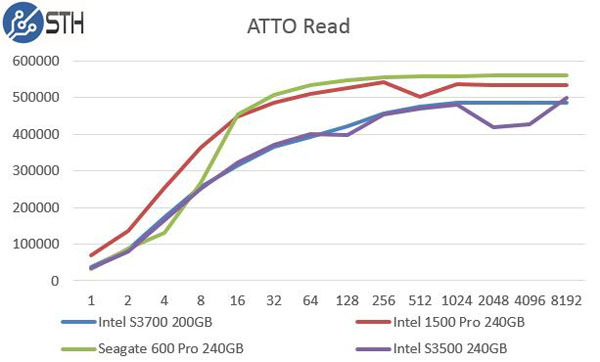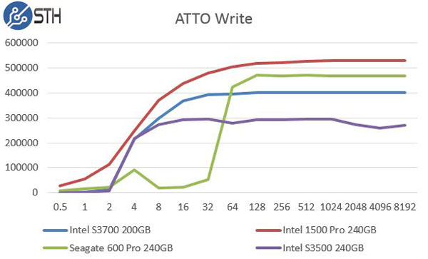 On the ATTO read side we see some of the more consumer oriented drives put up some significantly higher numbers. On the other hand, we can see very close groupings between the S3500 and S3700 in our tests.