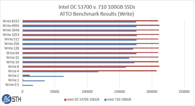 On the ATTO read side we again see the Intel 710 pull ahead at small transfer sizes. The SATA 2 to SATA 3 transition clearly helps the S3700 as the 710 is hitting an interface speed wall.