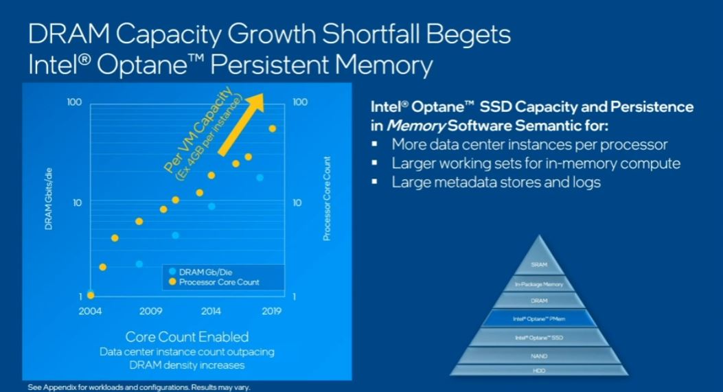Effectively what Intel is showing as part of its PMem 200 discussion is two main points. First, CPUs are now getting faster at a rate that is outpacing DRAM performance and capacity increases. At some point, to maintain or grow memory footprint per core, one needs to increase capacity, and DRAM growth is slowing.