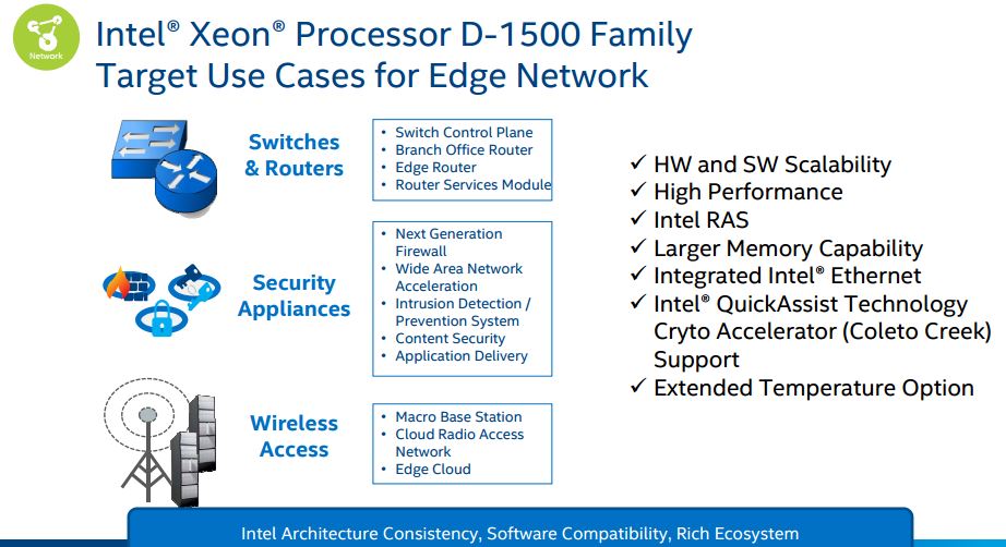 If you are reading this post, it is most likely that some part of this page is being served through a firewall with an Intel Atom C2x58 based SoC. The C25x8 was a notable departure from the C2x50 SKU in that it included QuickAssist technology. QuickAssist has been supported via OpenSSL for some time now. That makes serving HTTPS requests faster and has also been implemented in firewall suites like pfSense to accelerate OpenVPN VPN connections. One can see the impact of the new Xeon D networking SKUs. Here is the Intel slide on the optimizations and applications targeted:
