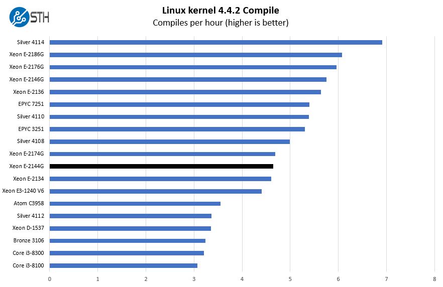 Here we see both small incremental performance of the Intel Xeon E-2144G and the Xeon E-2134 and Xeon E-2174G CPUs. Clock speeds are very similar and the chips have the same core count which means we expect very small differences between them.