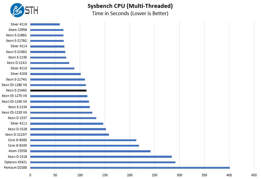 Here again, there is a very large delta between the previous generation parts and the new Intel Xeon E-2144G. The high clock speeds help, propelling the Xeon E-2144G beyond the 16 core Intel Atom C3958 and almost to the 8-core Intel Xeon Silver 4108 speeds.