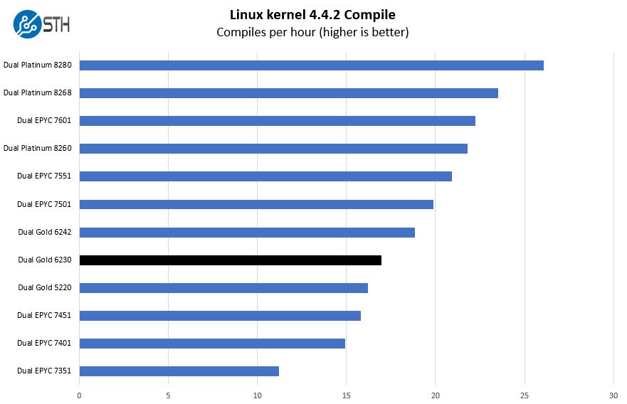 We had the Intel Xeon Gold 6130 numbers in this chart to show the performance delta. As you can see, the dual Intel Xeon Gold 6230 is a lot faster than the previous generation part.
