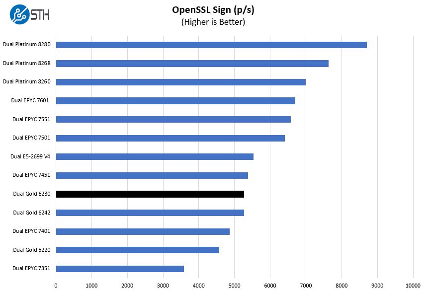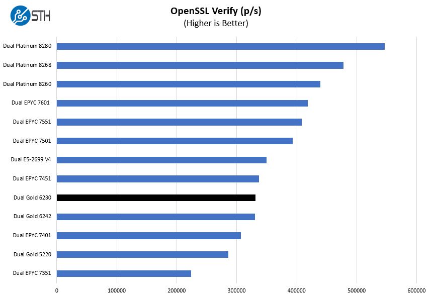 OpenSSL is a foundational technology in enterprise applications. As you may have noticed, the 16-core Intel Xeon Gold 6242 has been trading places with the Intel Xeon Gold 6230 on many tests. The Gold 6242 has a clock speed advantage while the Xeon Gold 6230 has a core count advantage.