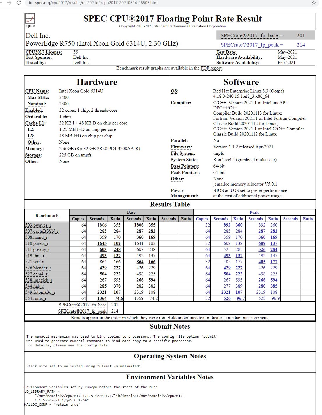 SPECrate2017_fp_base Dell PowerEdge R750 Xeon Gold 6314U