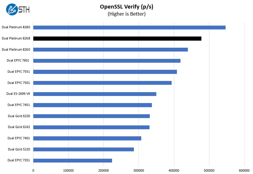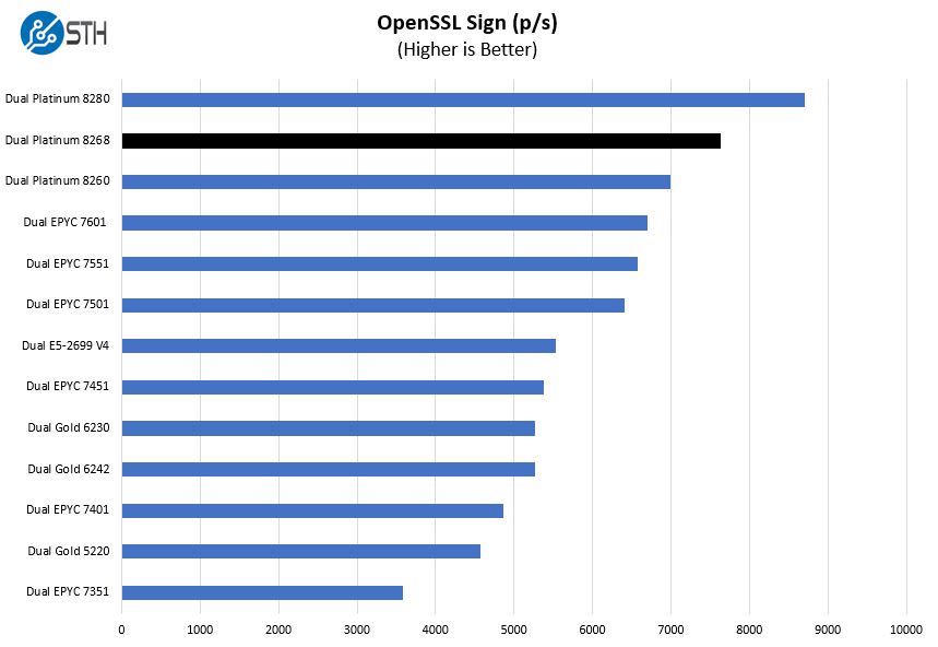 OpenSSL is a foundational technology in enterprise applications. Here we see the Intel Xeon Platinum 8268 notch a fairly clear victory over the Intel Xeon Platinum 8260. The difference here is an increase of 500MHz in the base clock alongside a 40W higher TDP.