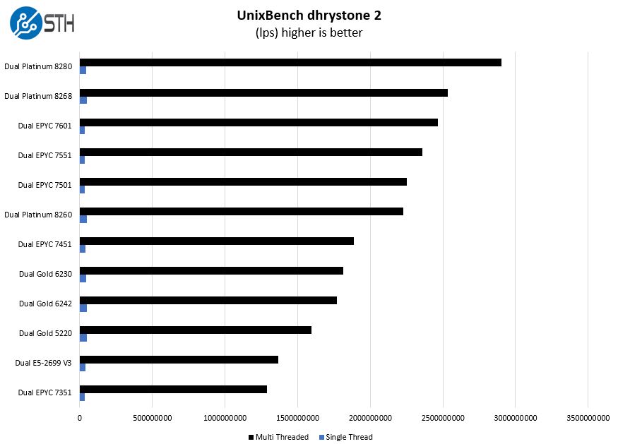 Some of the longest-running tests at STH are the venerable UnixBench 5.1.3 Dhrystone 2 and Whetstone results. They are certainly aging, however, we constantly get requests for them, and many angry notes when we leave them out. UnixBench is widely used so we are including it in this data set. Here are the Dhrystone 2 results:
