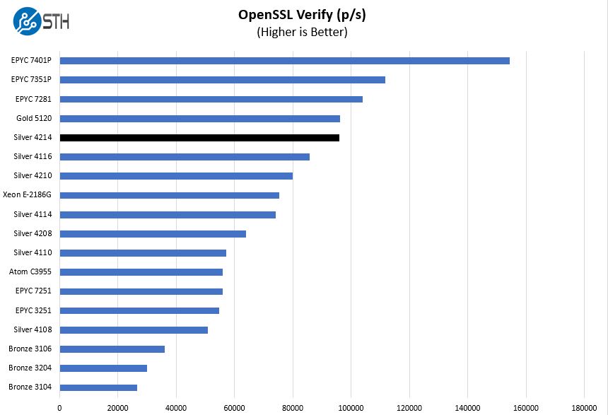 AMD performs well here, but we wanted to focus on the Intel-to-Intel comparison. With 12 cores, the Intel Xeon Silver 4214 performs very well compared to the Intel Xeon Silver 4114.