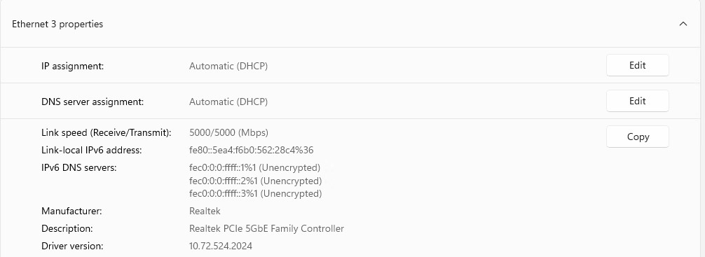 Realtek PCIe 5GbE Family Controller Installed Windows 11 5Gbps Link