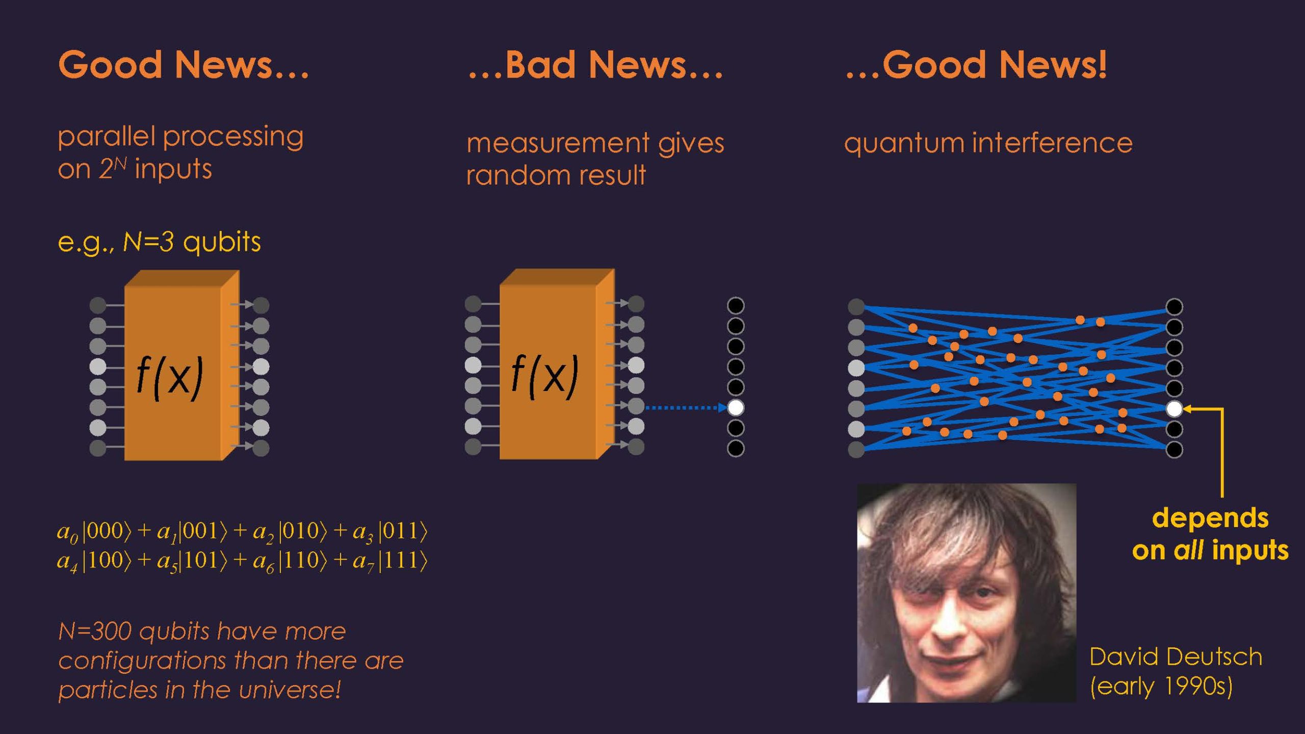 An example of where this can be applied, and where quantum computing will be a game-changer, is encryption. Here, one of the big challenges is factoring big numbers. With quantum, the algorithm is much more efficient. You can see the quantum interference chart above which may help understand how this works.