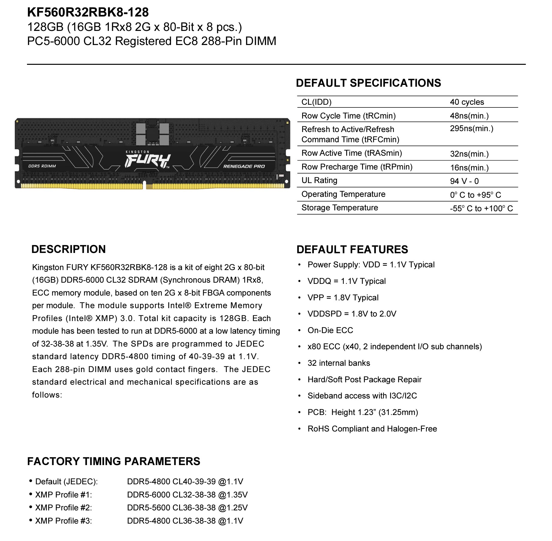 Kingston Fury Renegade Pro KF560R32RBK8 128 16GB ECC DDR5 6000 DIMM Spec Sheet