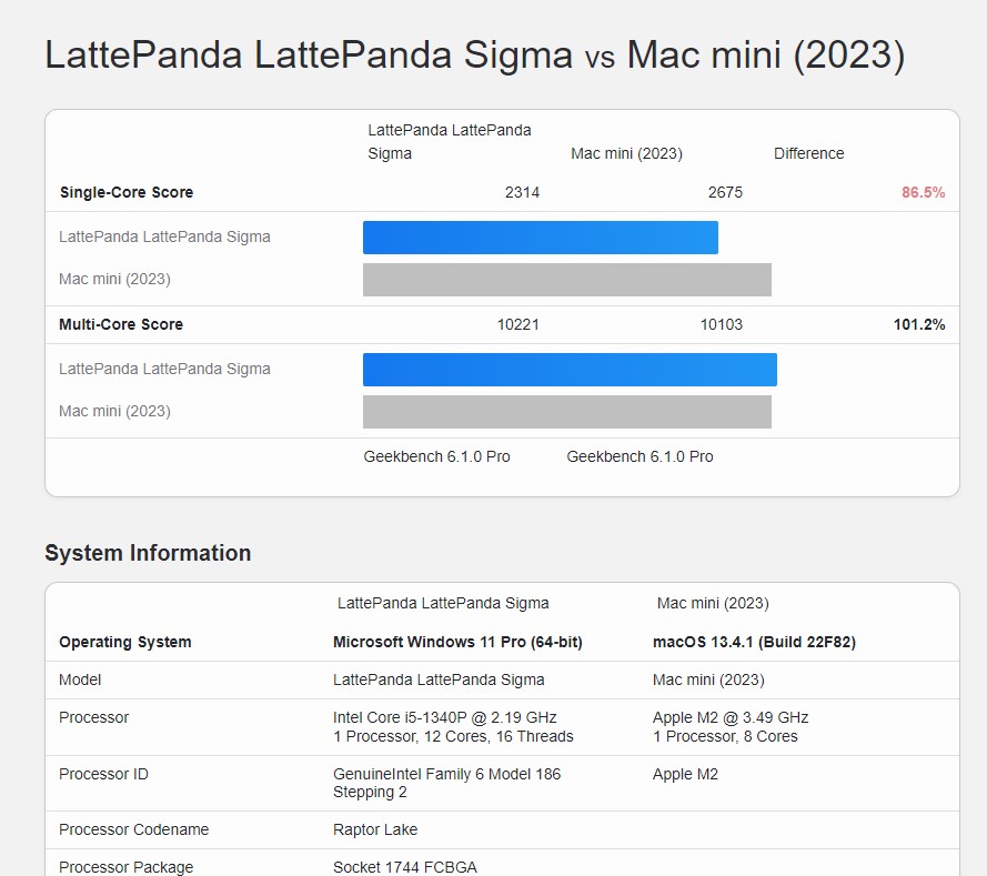 LattePanda Sigma Vs Mac Mini M2 Geekbench 6.1