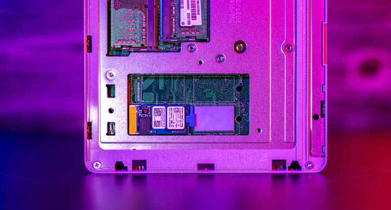 Like the Lenovo Tiny designs, there is another area with the SODIMM and M.2 storage. This area is not tool-less and instead requires removing three screws plus the fabric to get to.