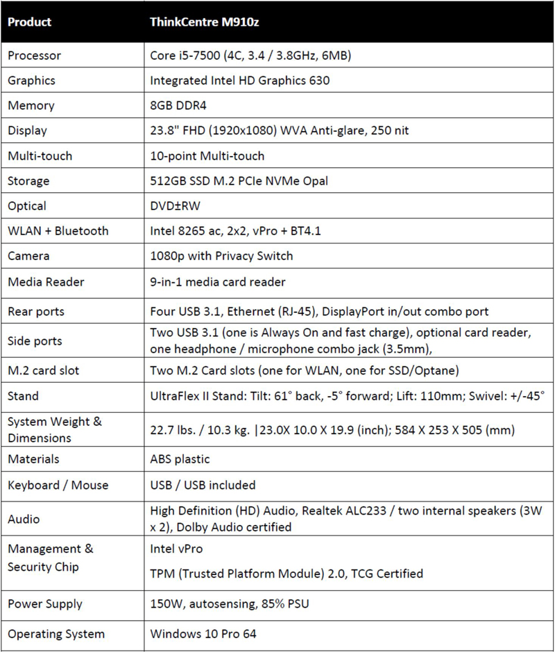 Here is the key spec sheet for the ThinkCentre M910z AIO: