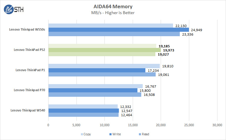 Our Lenovo ThinkPad P52 has only one stick of memory installed. Installing additional memory sticks in the ThinkPad P52 would provide us with higher results that we see here. Although it increases power consumption and therefore decreases battery life, populating a second SODIMM can double memory performance.