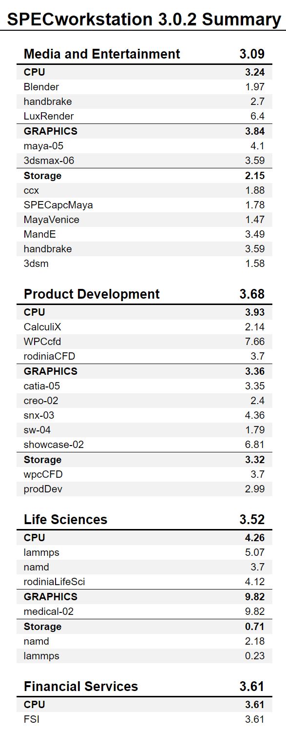 SPECworkstation 3 has been updated to 3.0.2, which measures the 3D graphics performance of systems running under the OpenGL and Direct X application programming interfaces. As a result of the new update, we cannot compare between past version 3 results, so we will show the screenshot of the results here and graph them in later reviews.