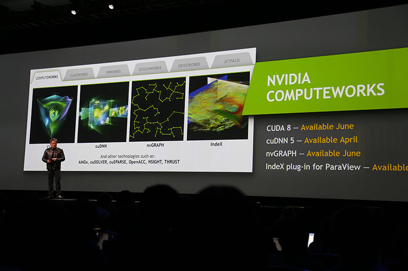 NVIDIA Compute works – CUDA 8 is coming in June. cuDNN 5 for training neural networks, faster and with new features. nvGRAPH for quickly analyzing graph information. IndeX for indesxing large amounts of information.