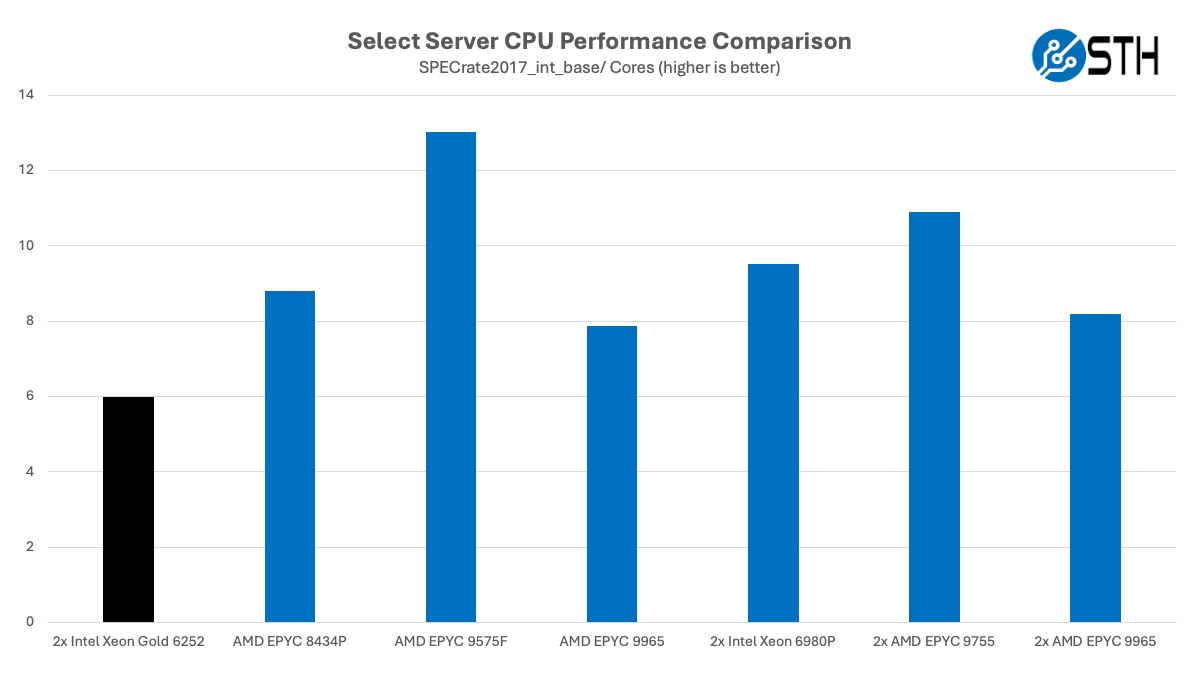 SPECrate2017_int_base Per Core Of 2x Intel Xeon Gold 6252 Versus Newer AMD And Intel CPUs From Recent STH Pieces