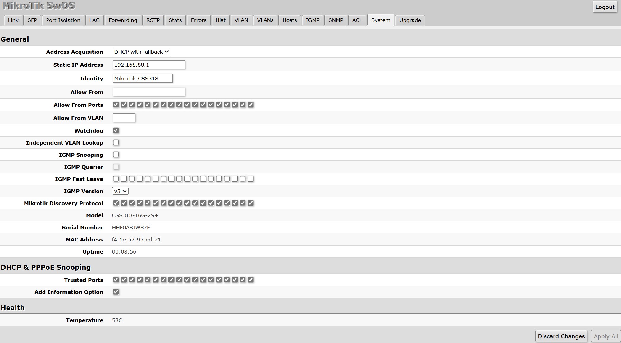 MikroTik CSS318 16G 2S+IN SwOS Link Aggregation