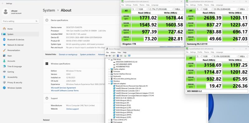 We took a quick screenshot with the three drives shown in photos earlier installed and just ran CrystalDiskMark to see what the results were.