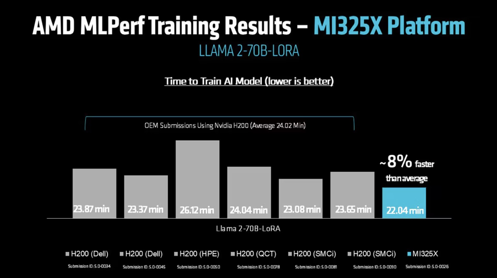 AMD Instinct MI325X versus NVIDIA H200 MLPerf Training v5.0 llama2 70b