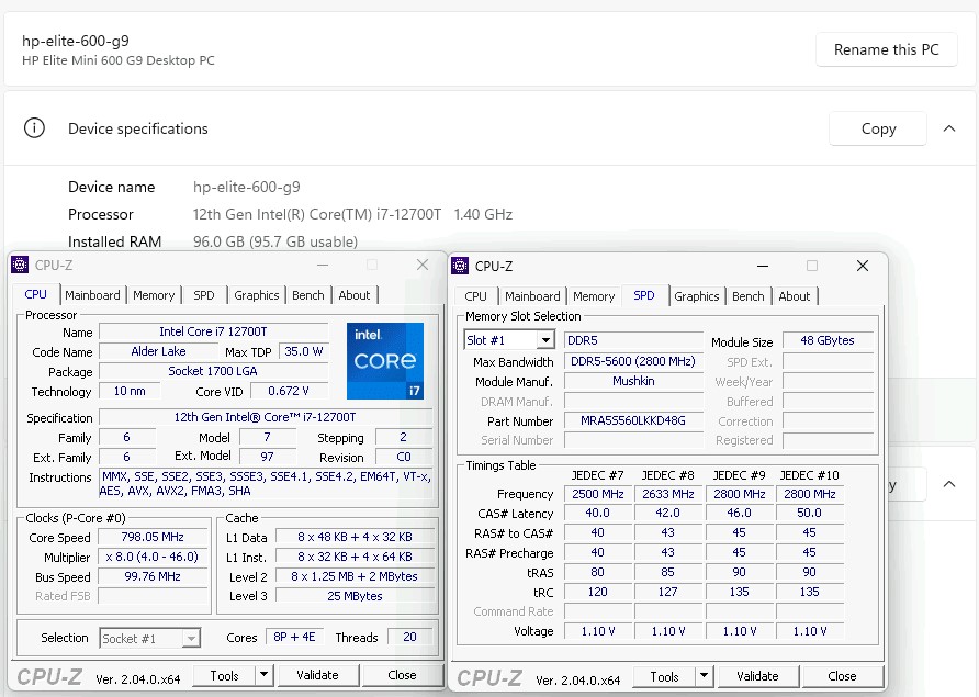 Mushkin Redline 96GB DDR5 5600 Kit 2x 48GB In HP Elite Mini 600 G9 1