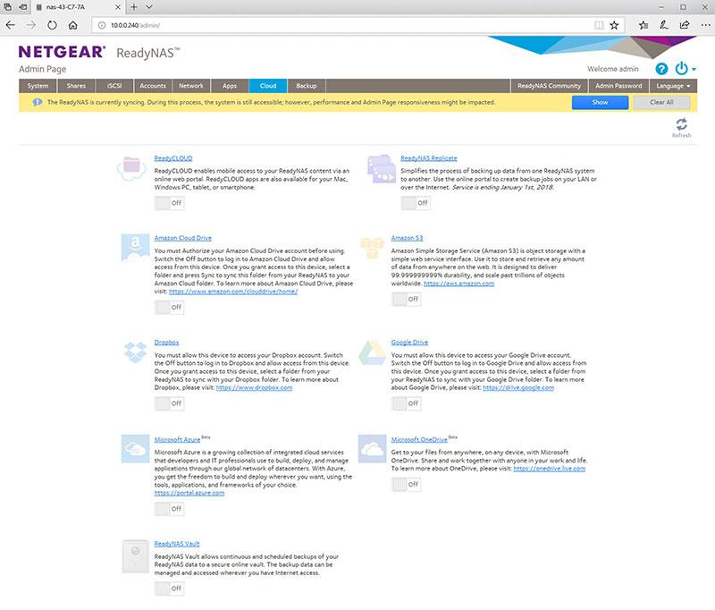 Perhaps most useful is a wide range of Cloud backup server options is available which include ReadyCloud and ReadyNAS remote application. For SMB users who need an offsite backup, this is a great feature as it means you do not need to set up a remote data center option.