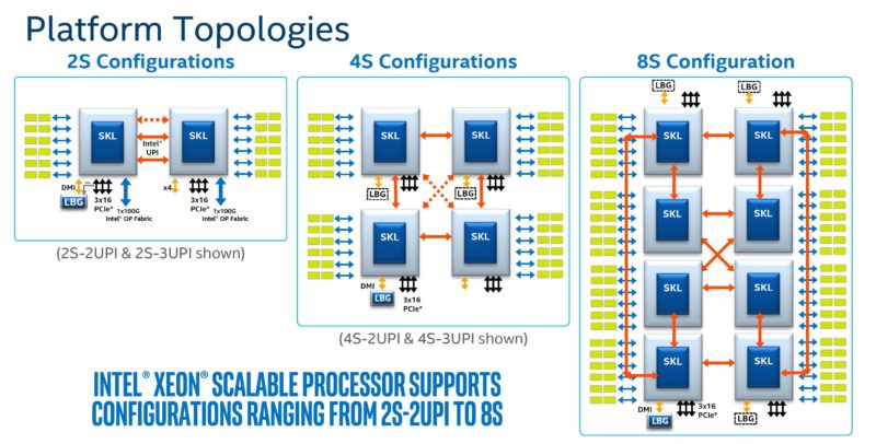 While Intel’s 3x UPI chips allow direct connections between each CPU in a 4x CPU configuration, Intel also supports a glue-less topology. Here are the common topologies for Skylake (1st Generation Intel Xeon Scalable) and Cascade Lake (2nd Generation Intel Xeon Scalable):
