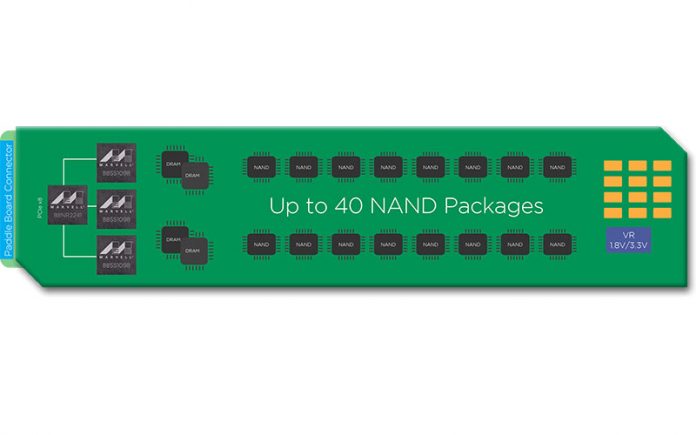 For higher-performance applications, such as the one demoed at OCP Summit 2018, Marvell can use its NVMe switch to aggregate the performance of multiple sets of NAND and DRAM cache behind its new NVMe controllers.