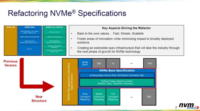 Part of this is that the new base specification covers a number of the key underlying features such as the NVM Block Command Set. The management interface remains its own track, but then we can have Zoned Namespaces, Key Value (NVMe-KV), and even rotational media map using that base specification.