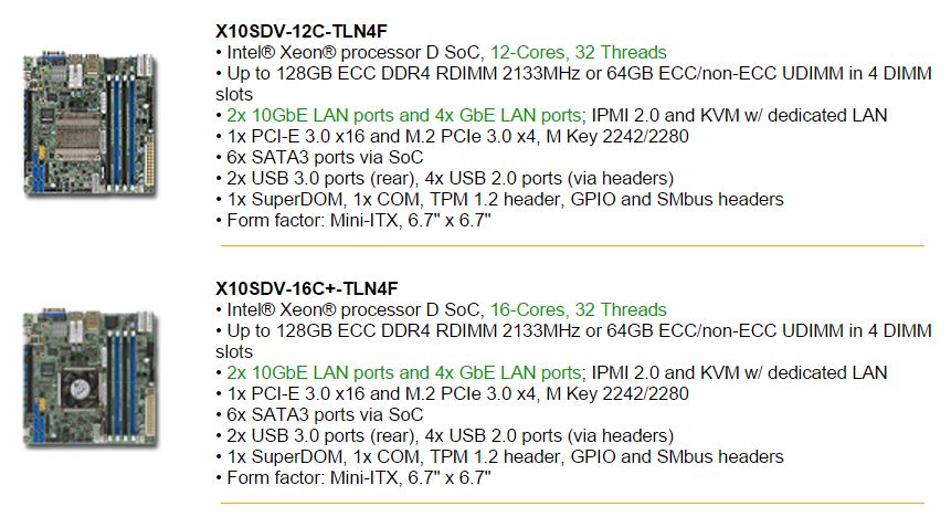 Although the official product release is slated for next quarter, Supermicro has details on their next-generation high-end Xeon D models. The Supermicro X10SDV-16C+-TLN4F will have 16 cores and 32 threads on the SOC while the Supermicro X10SDV-12C-TLN4F will support 12 cores and 24 threads. Both Supermicro X10SDV-12C-TLN4F and Supermicro X10SDV-16C+-TLN4F appear to support dual 10GbE ports and quad 1GbE ports. Here is a quick snap of the information we saw on Supermicro’s Xeon D page.