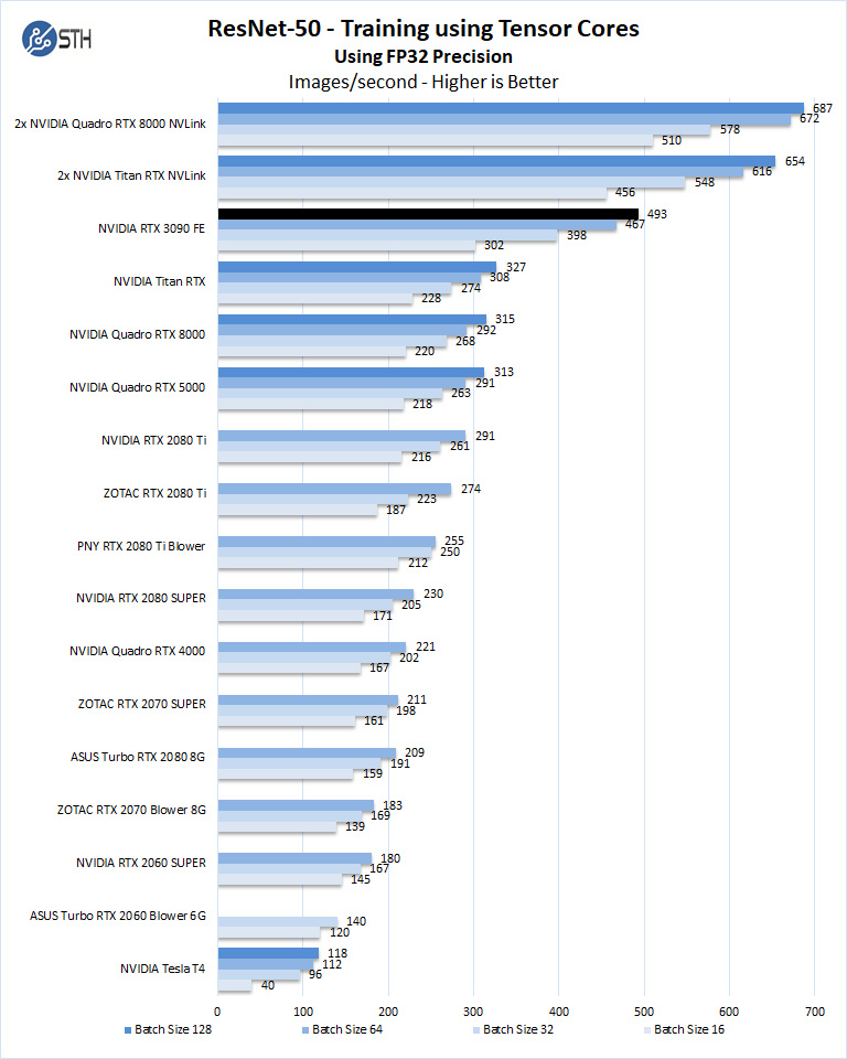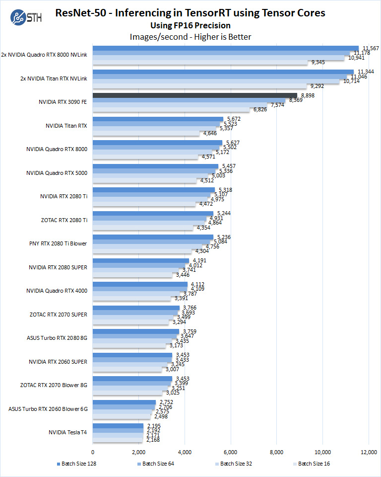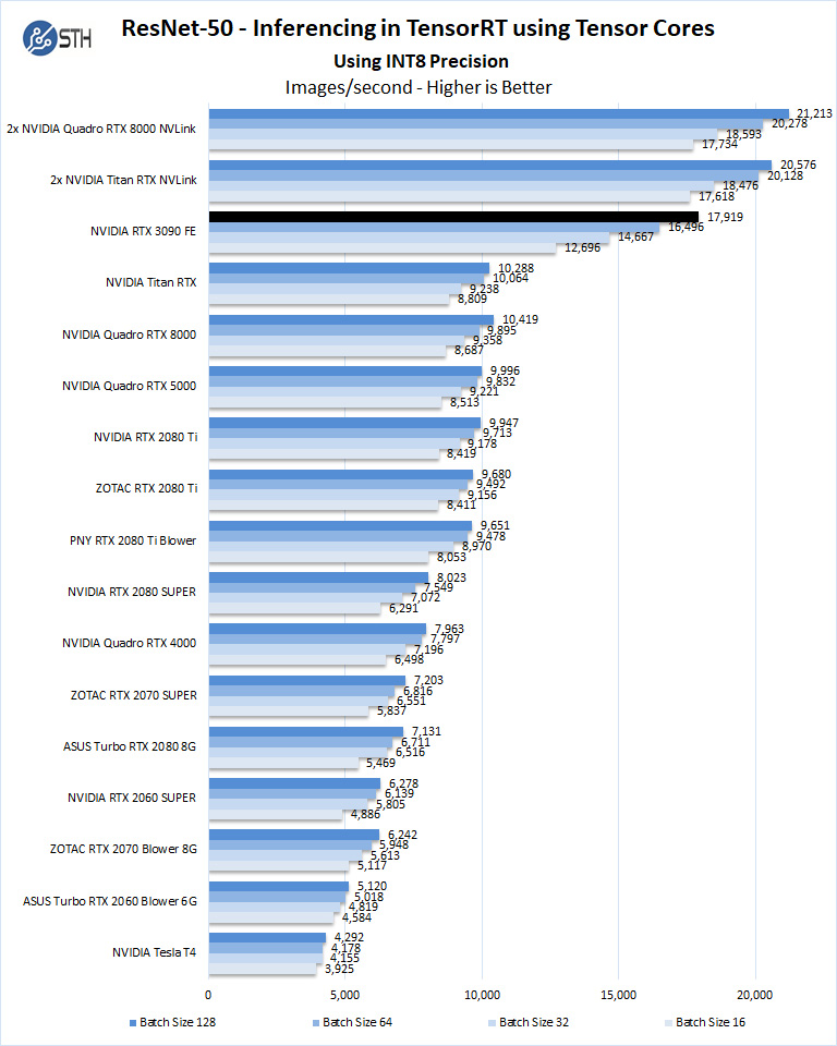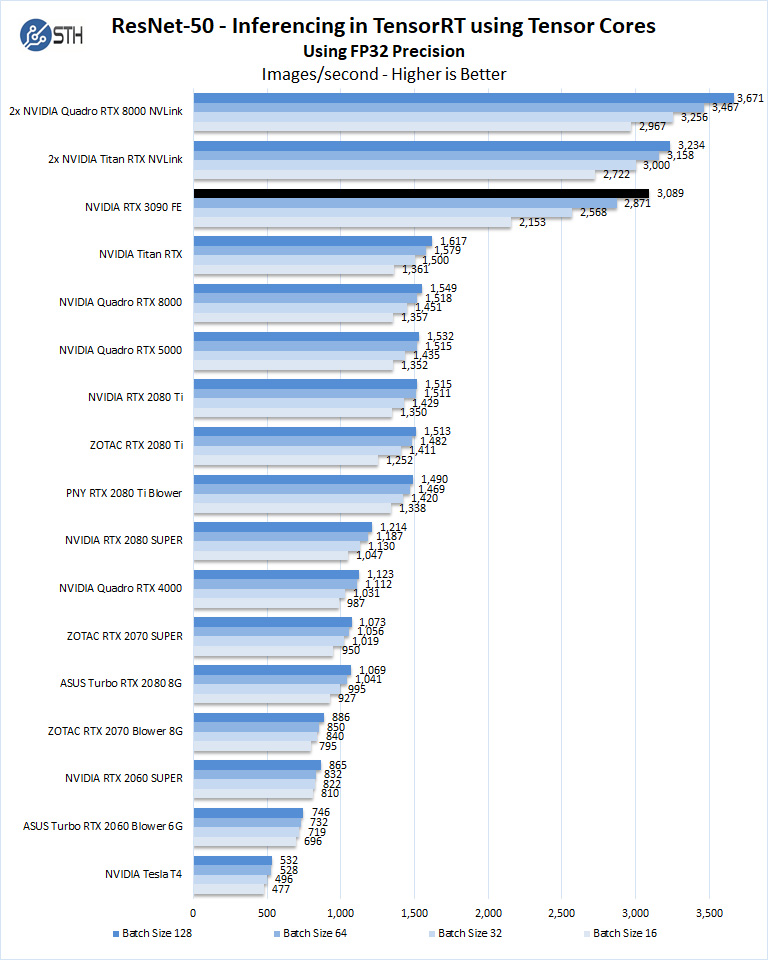 Here we are getting excellent performance with the new RTX 3090 setup. Not only are we somewhere closer to two Titan RTX’s, but we are also several times faster than the NVIDIA T4. For anyone building inferencing applications, a NVIDIA T4 is still a more deployable card in a low-profile single-slot package with much lower power requirements. For someone developing an application for inferencing, this is a great example of where using a GeForce card for development in a workstation can be a game-changer.