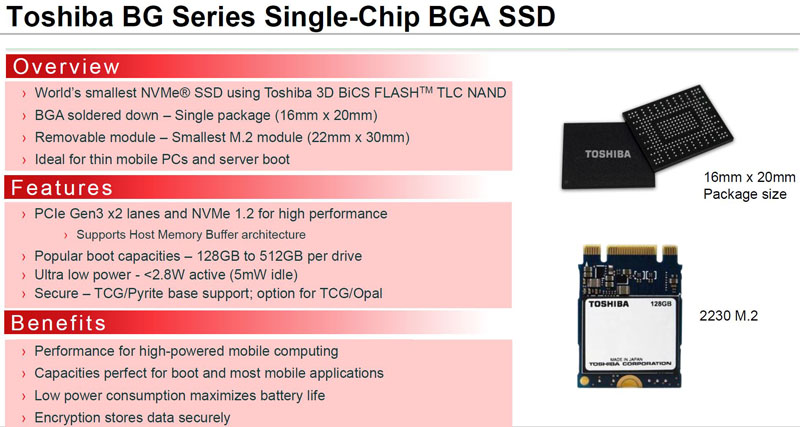 The Toshiba BG series is meant to deliver 95% lower footprints for storage than 2.5″ SATA SSDs. It comes as a BGA package but also in two flavors: a single package solution and a m.2 2230 module. Both modules utilize Toshiba’s BiCS TLC NAND and come in 128GB, 256GB and 512GB capacities.