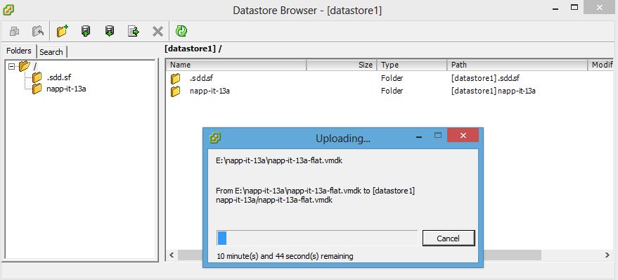 I have been trying this process (for two or three days now, can’t remember) and have continued to suffer disconnection of the datastore right before the completion of the transfer of all requisite files. I have tried uploading as a folder and as individual files of which all the small ones would go easily only for the actual .vmdk file to fail to complete.