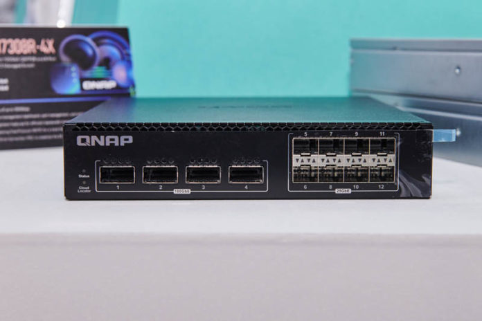 This QNAP QSW-M7308R-4X has four QSFP28 100GbE ports and eight 25GbE SFP28 ports.