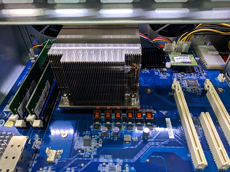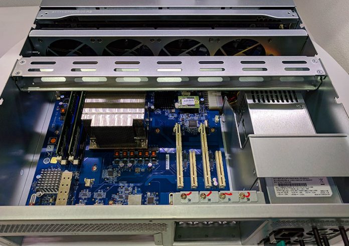 The AMD Ryzen CPU is housed under a large heatsink. One can also see the custom motherboard with networking, USB 3.0, optimized cable headers, and even a spot for a USB DOM that is used for QNAP’s OS.