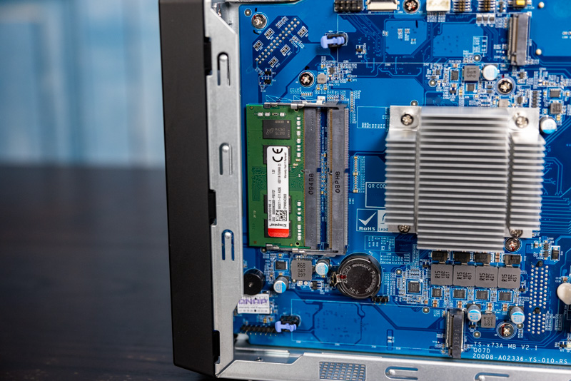 In terms of memory, we have a single 8GB DDR4 SODIMM from Kingston. The system, and the AMD Ryzen V1500B can handle up to 2x 32GB DDR4 ECC SODIMMs. Many of our readers purchasing this system for the virtualization and container features will end up upgrading the RAM here and 2x 16GB modules is usually a good price/ performance fit for a 4 core/ 8 thread NAS. Still, there is an easy upgrade path to 16GB support by adding a second SODIMM.