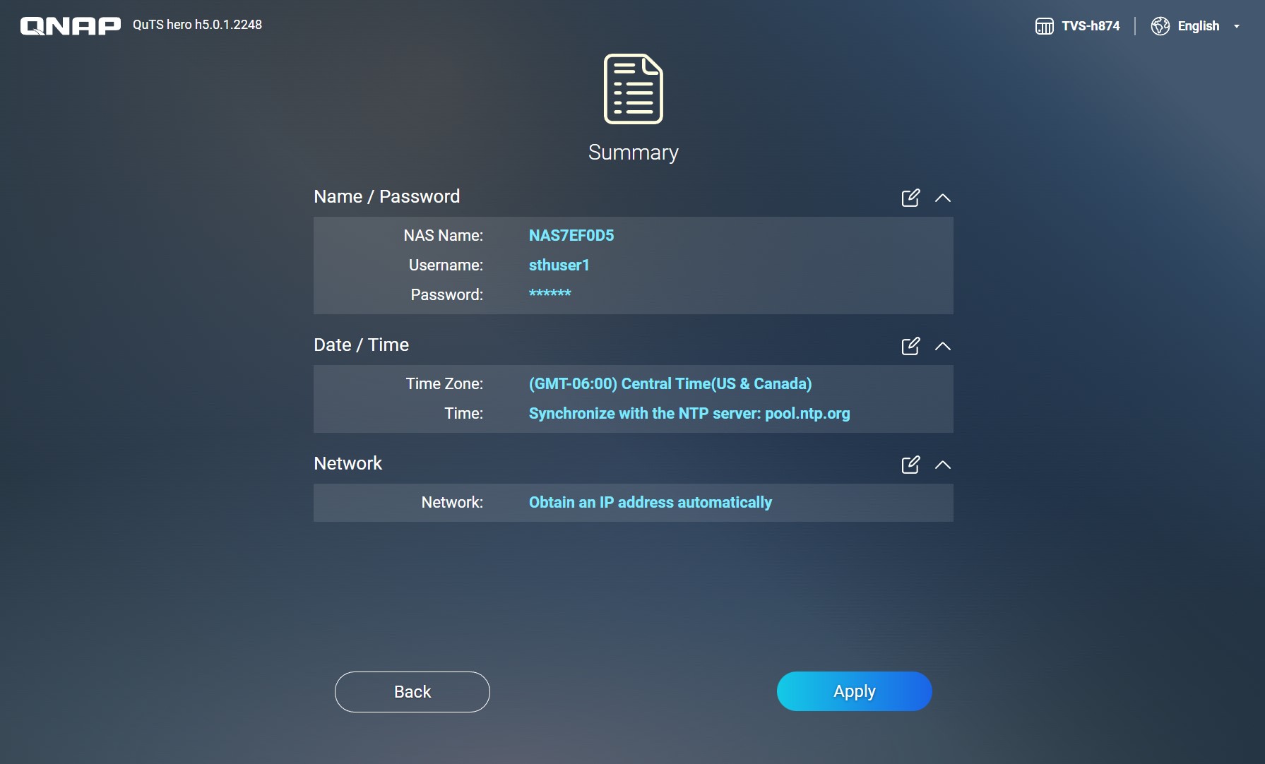 QNAP TVS H874 QuTS Hero 5 Installation Wizard Summary