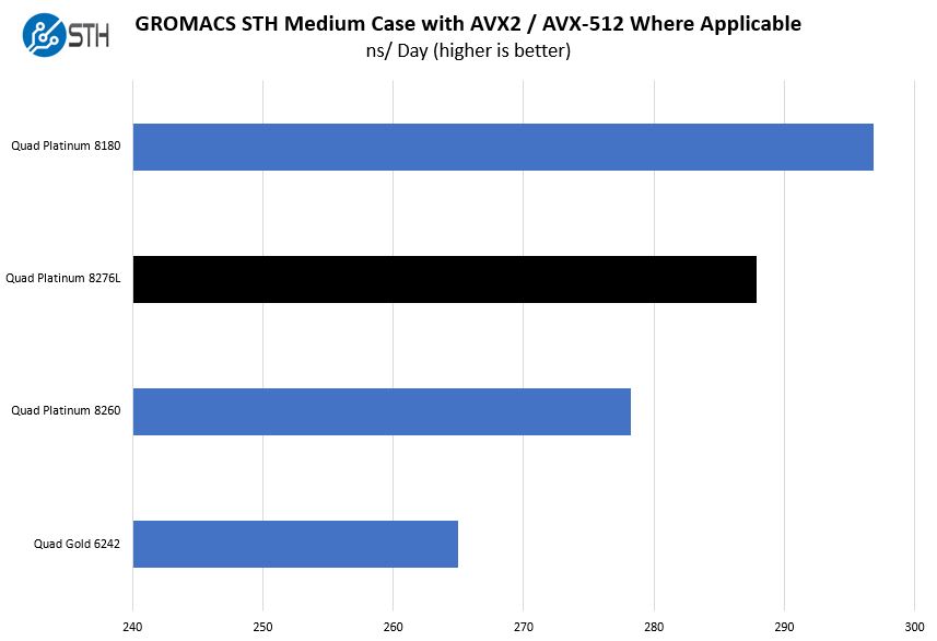 Here we see solid scaling putting the quad Intel Xeon Platinum 8276L between the quad Intel Xeon Platinum 8180 and Platinum 8176 figures.