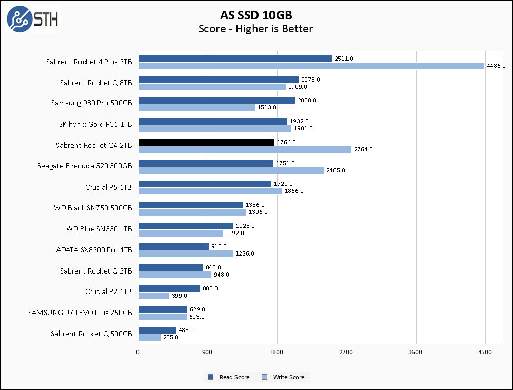 Similar to the results in Anvil, the larger AS SSD test set knocks the Sabrent Rocket Q4 2TB down a few spots. The results are still good, just not chart-topping.
