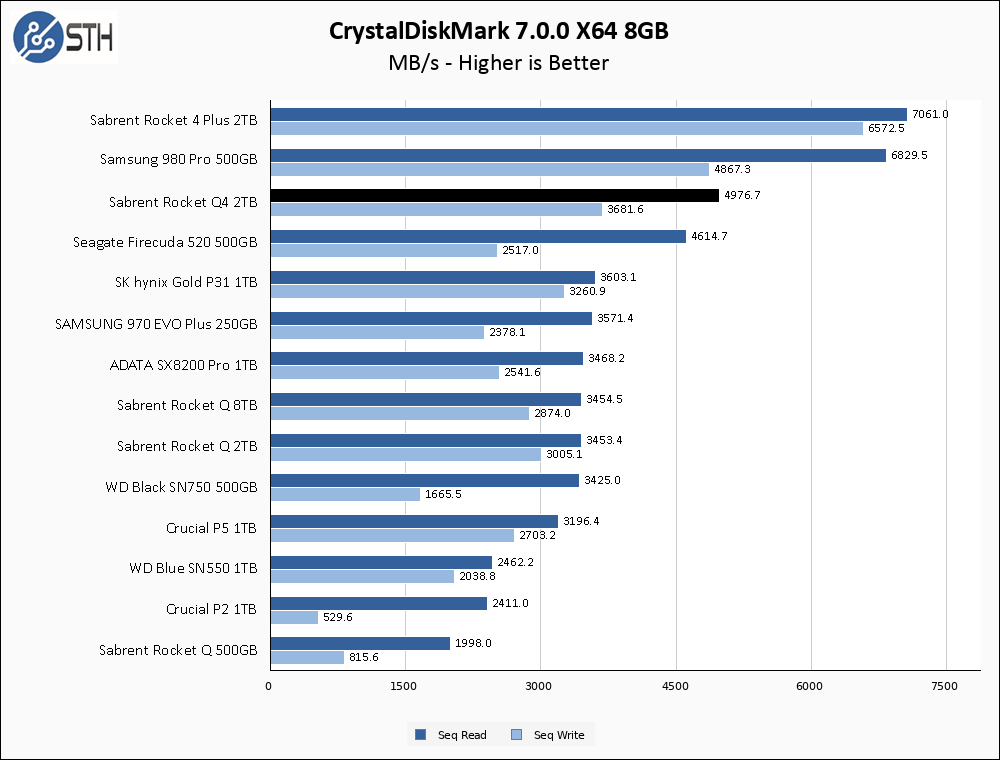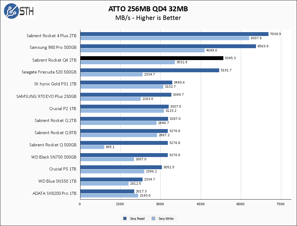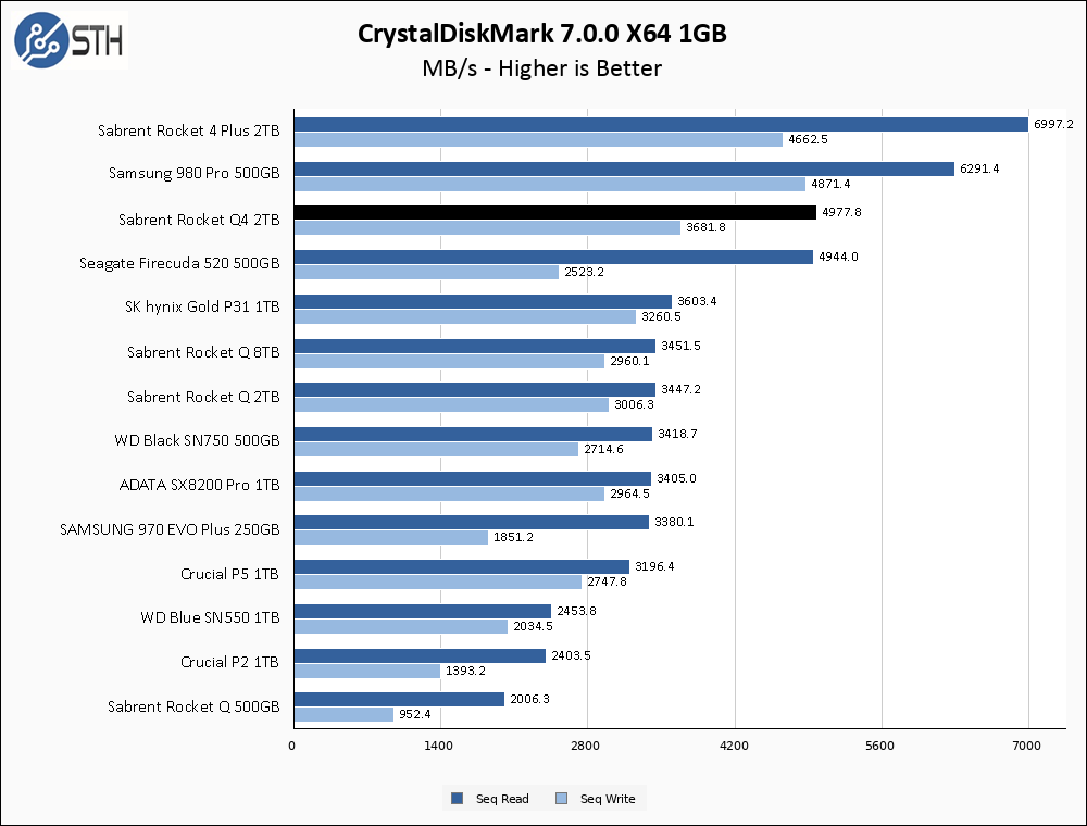 The Sabrent Rocket Q4 2TB starts off strong, and exceeds its rated sequential read and write specifications by a small amount. The only drives to beat it are the Samsung 980 Pro 500GB and Sabrent’s performance flagship the Rocket 4 Plus.